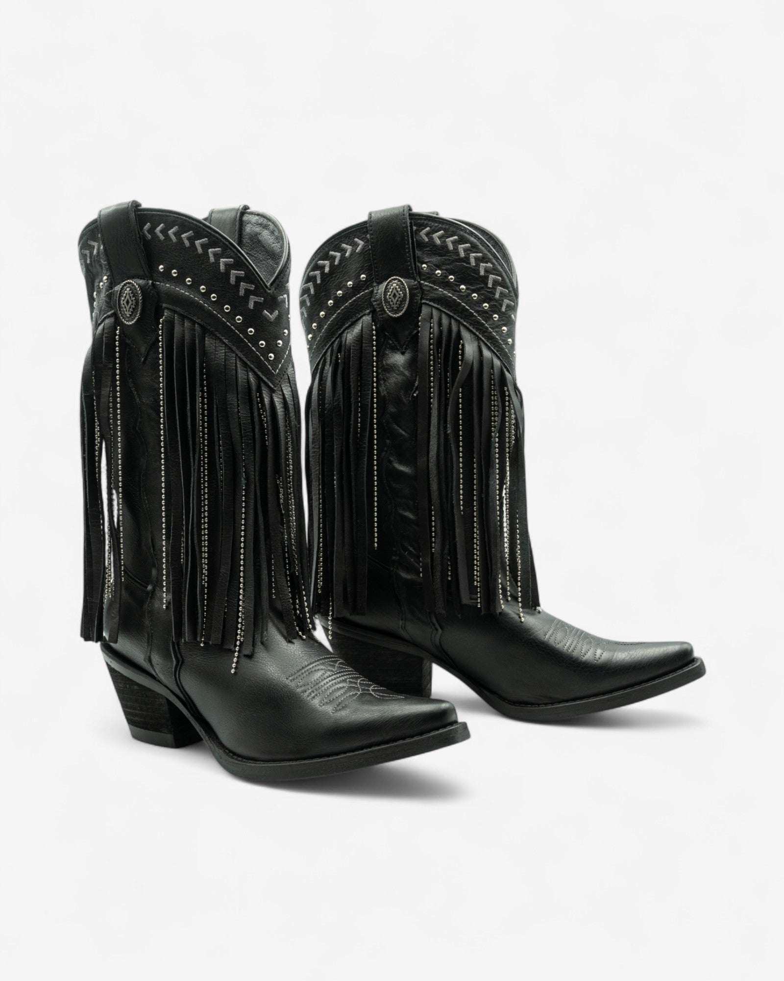 El Espectáculo del Movimiento: El alma de la bota reside en sus largas 'barbas' de piel. Este fleco artesanal cobra vida contigo, creando una cascada de movimiento dinámico y audaz que captura todas las miradas. Son las botas perfectas para la pista de baile, un concierto o cualquier lugar donde quieras ser inolvidable.