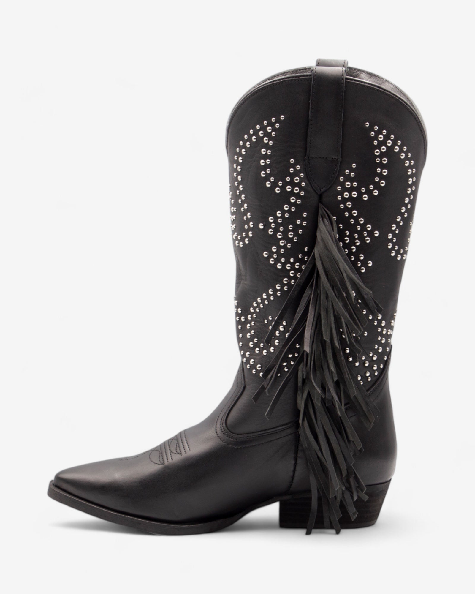 Esta bota destaca por su diseño atrevido, fusionando el estilo vaquero con un toque moderno y sofisticado. Flecos laterales en movimiento y aplicaciones metálicas le otorgan una personalidad audaz y distintiva. Perfecta para mujeres que buscan marcar tendencia y reflejar su esencia única, su estructura en piel de alta calidad garantiza comodidad y durabilidad. Un calzado versátil que transforma cualquier outfit en una declaración de estilo.