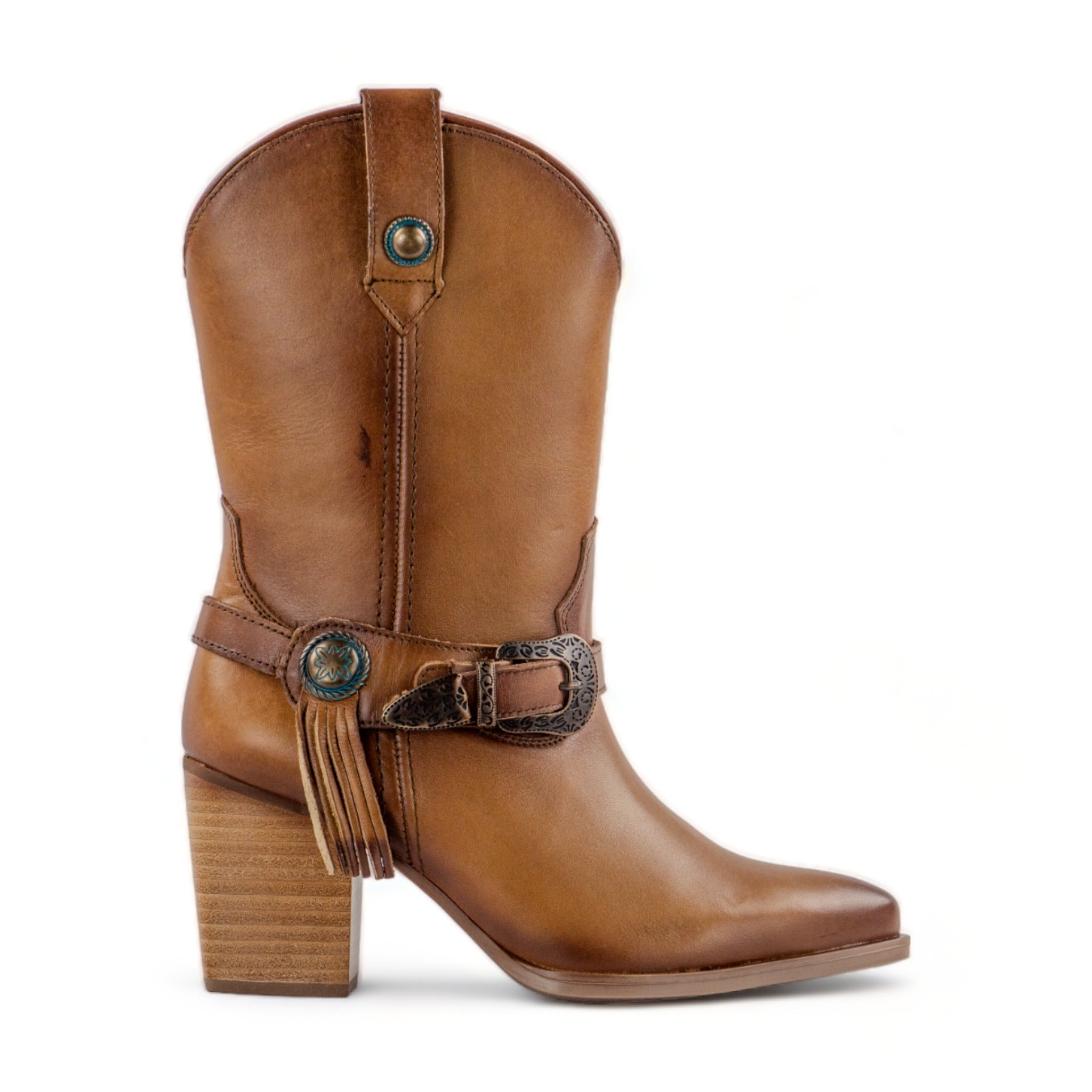 La Cecilia es una bota de media caña en piel genuina, con silueta inspirada en el estilo western. Incorpora un tacón de bloque medio que brinda estabilidad y un diseño estructurado que estiliza la pierna.