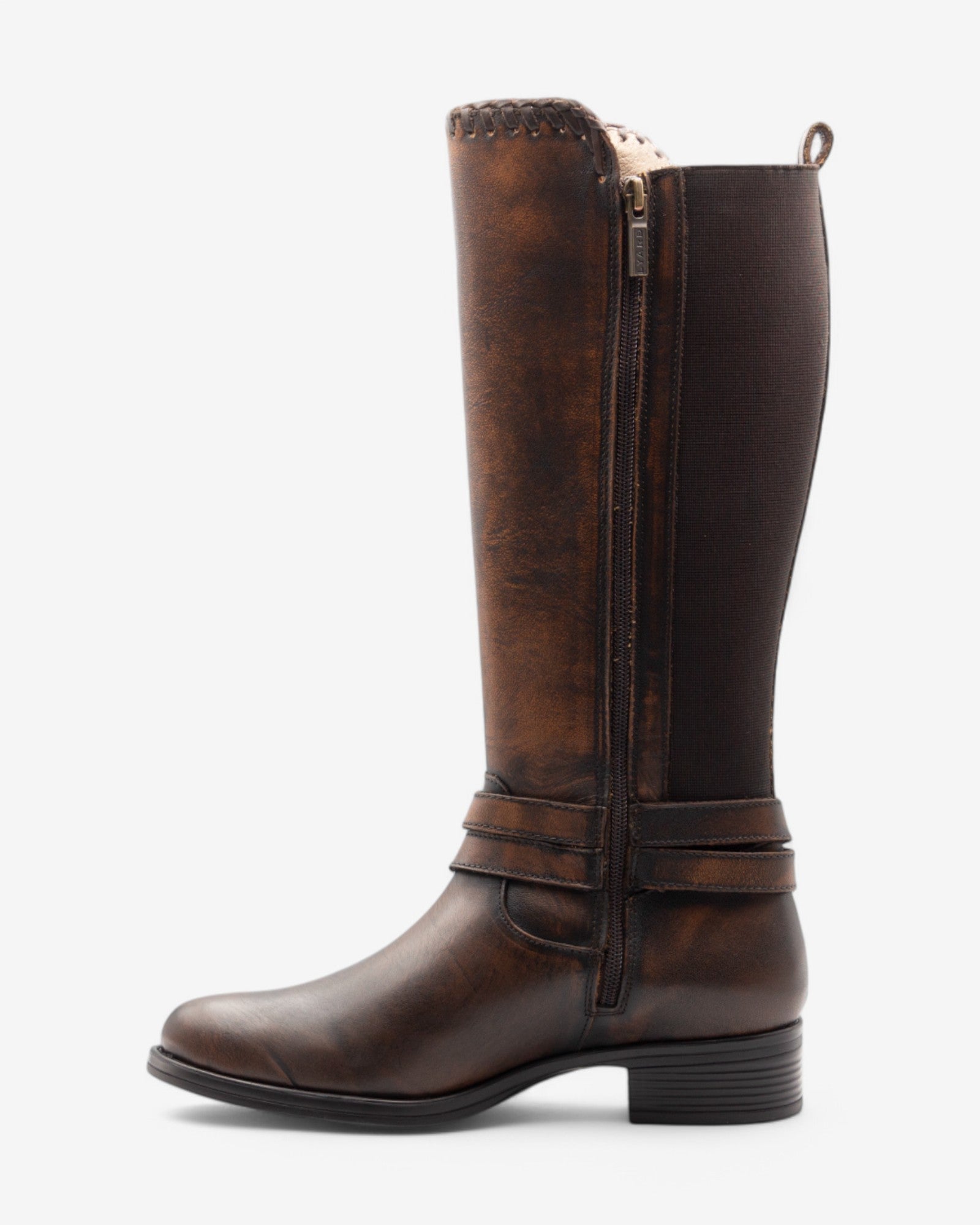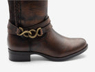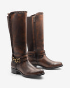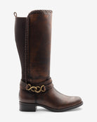 Sofisticación ecuestre. Inspiradas en el mundo de la equitación, estas botas altas de piel marrón, con su hebilla metálica en forma de cadena, te permitirán crear looks tanto casuales como más formales.