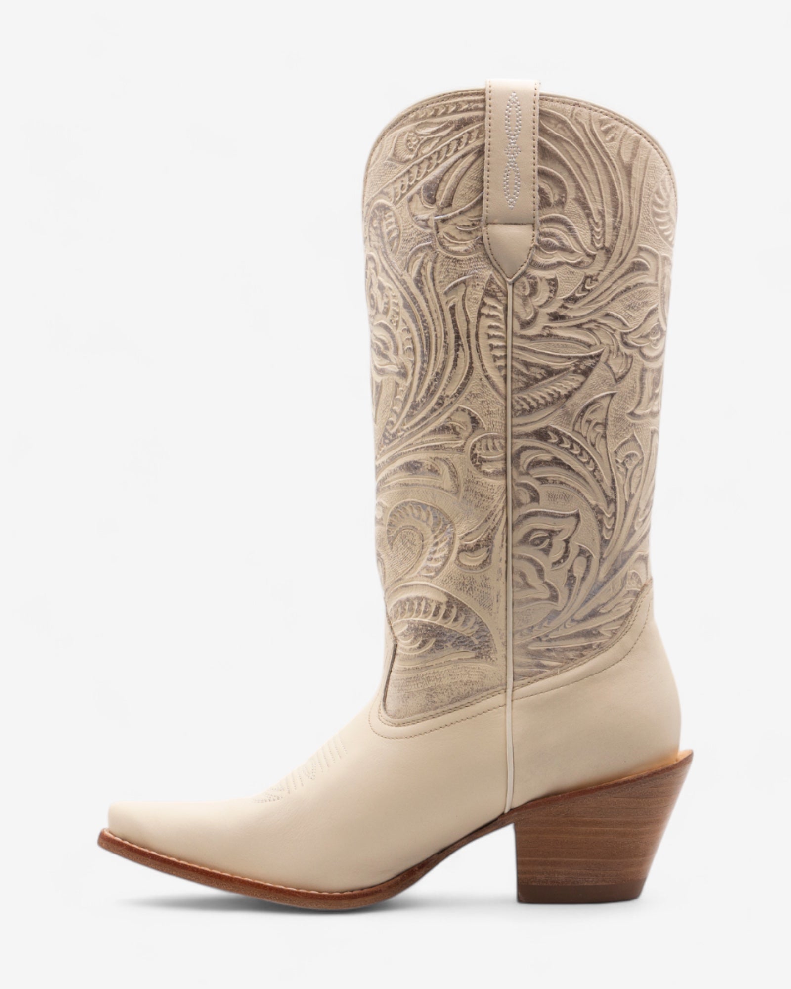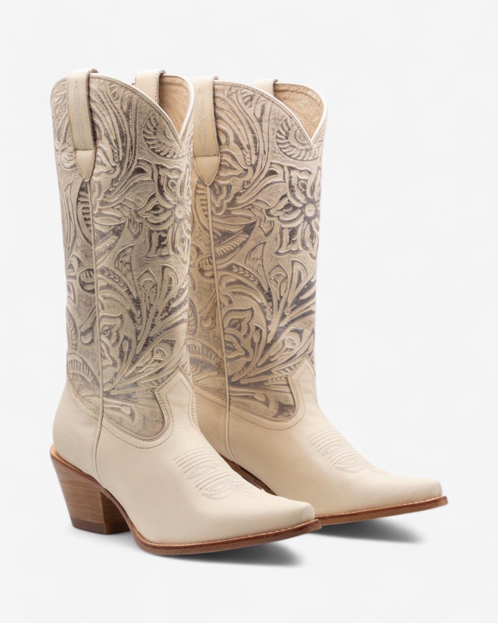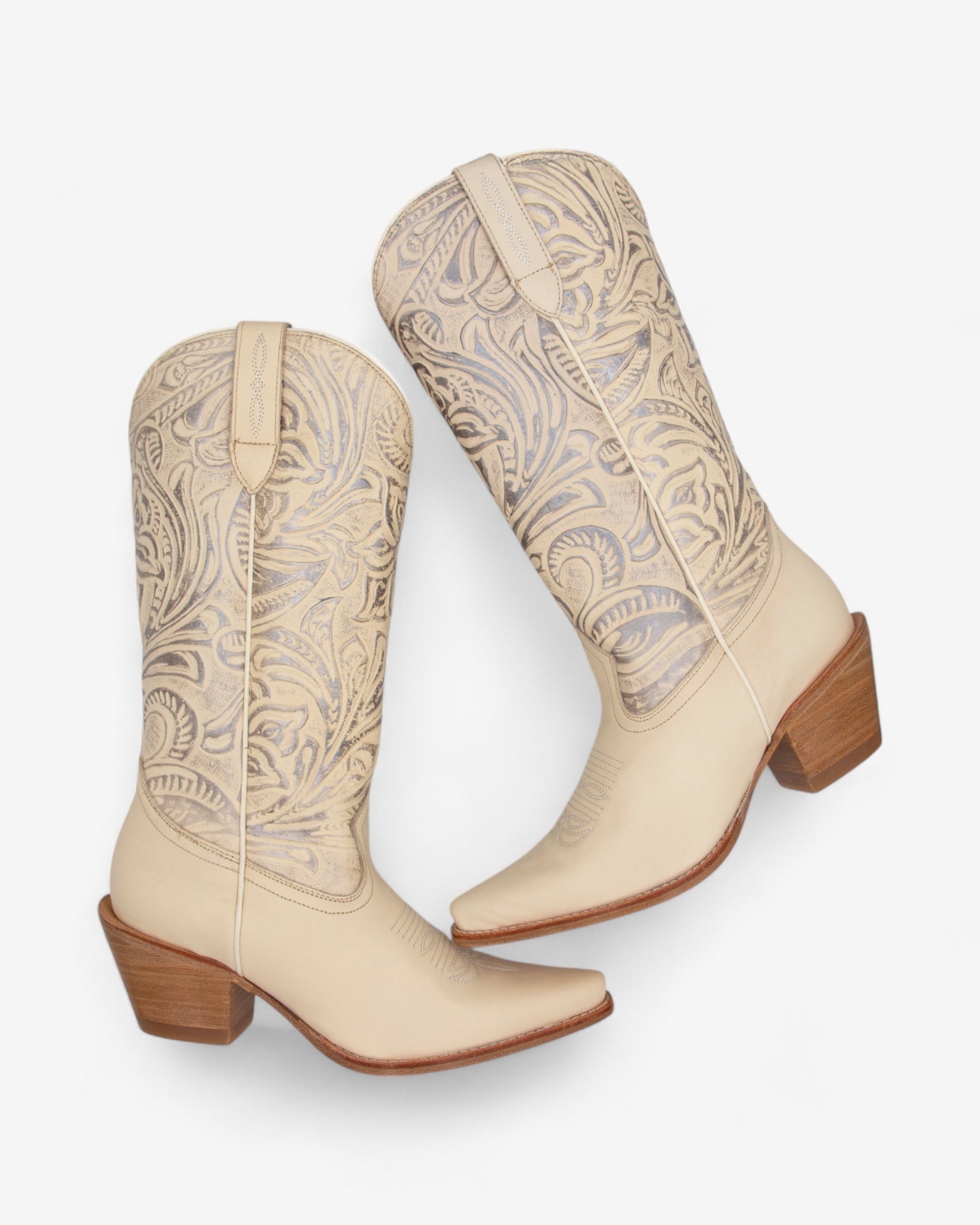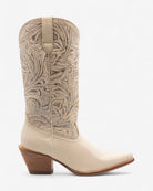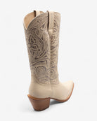 Elegancia y sofisticación en cada detalle. Confeccionadas en piel con grabados intrincados y un acabado impecable, estas botas son una pieza única que eleva cualquier look. Su tono bone, neutro y refinado, las convierte en un complemento versátil, perfecto para adaptarse a cualquier ocasión, desde un outfit casual hasta un conjunto más sofisticado.