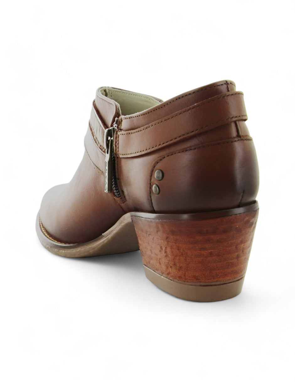 Botín bajo estilo vaquero de piel con cierre lateral, pulseras en el tobillo con hebillas, trenzados y estoperoles. Ideales para lucir con todos los estilos.