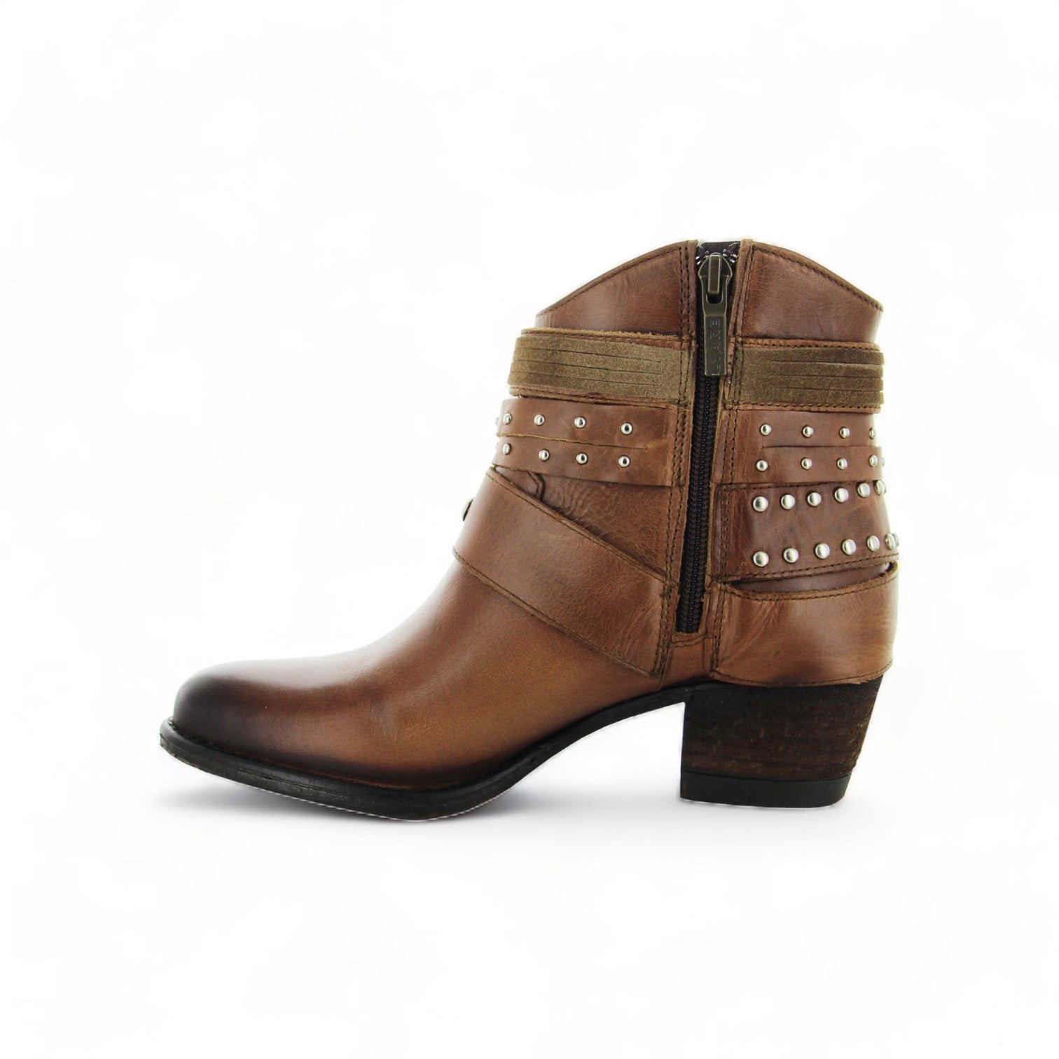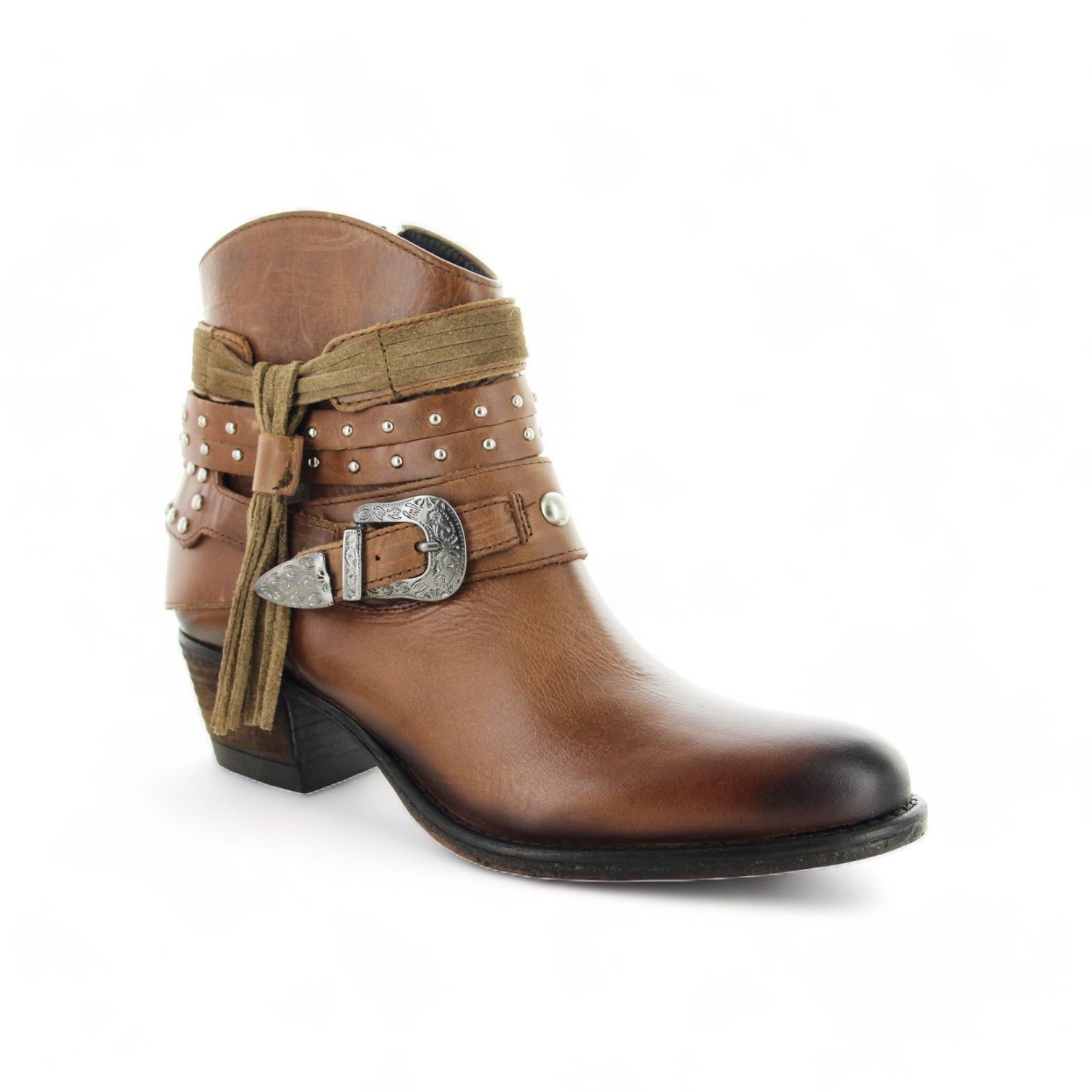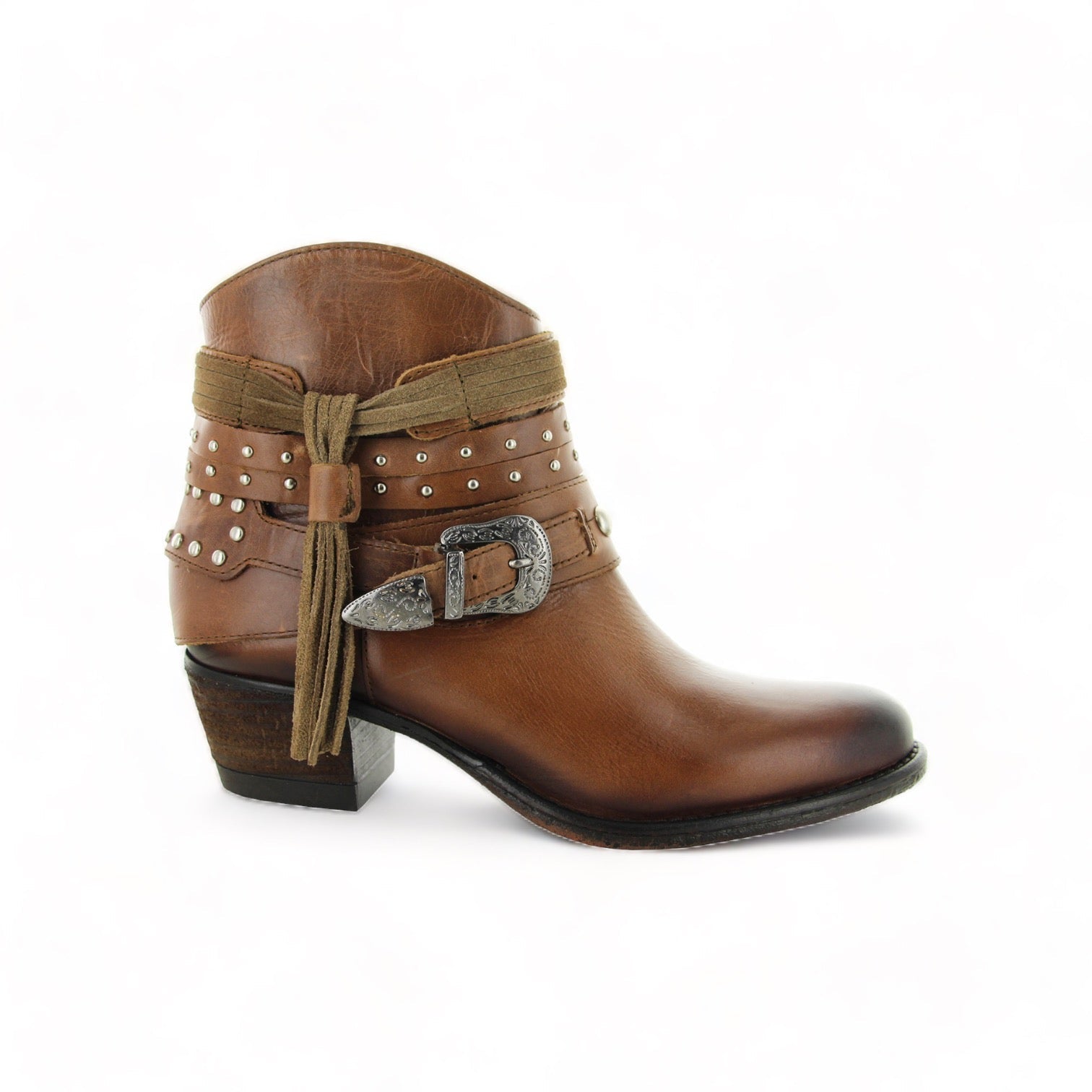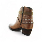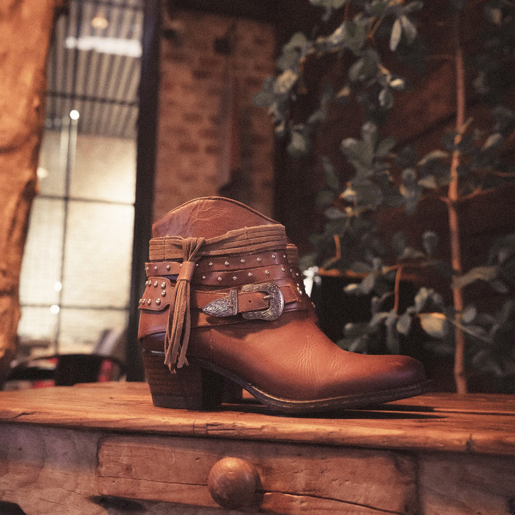 Modelo de botín con adornos en arnés usando elementos tradicionales western para crear un estilo clásico y vanguardista.