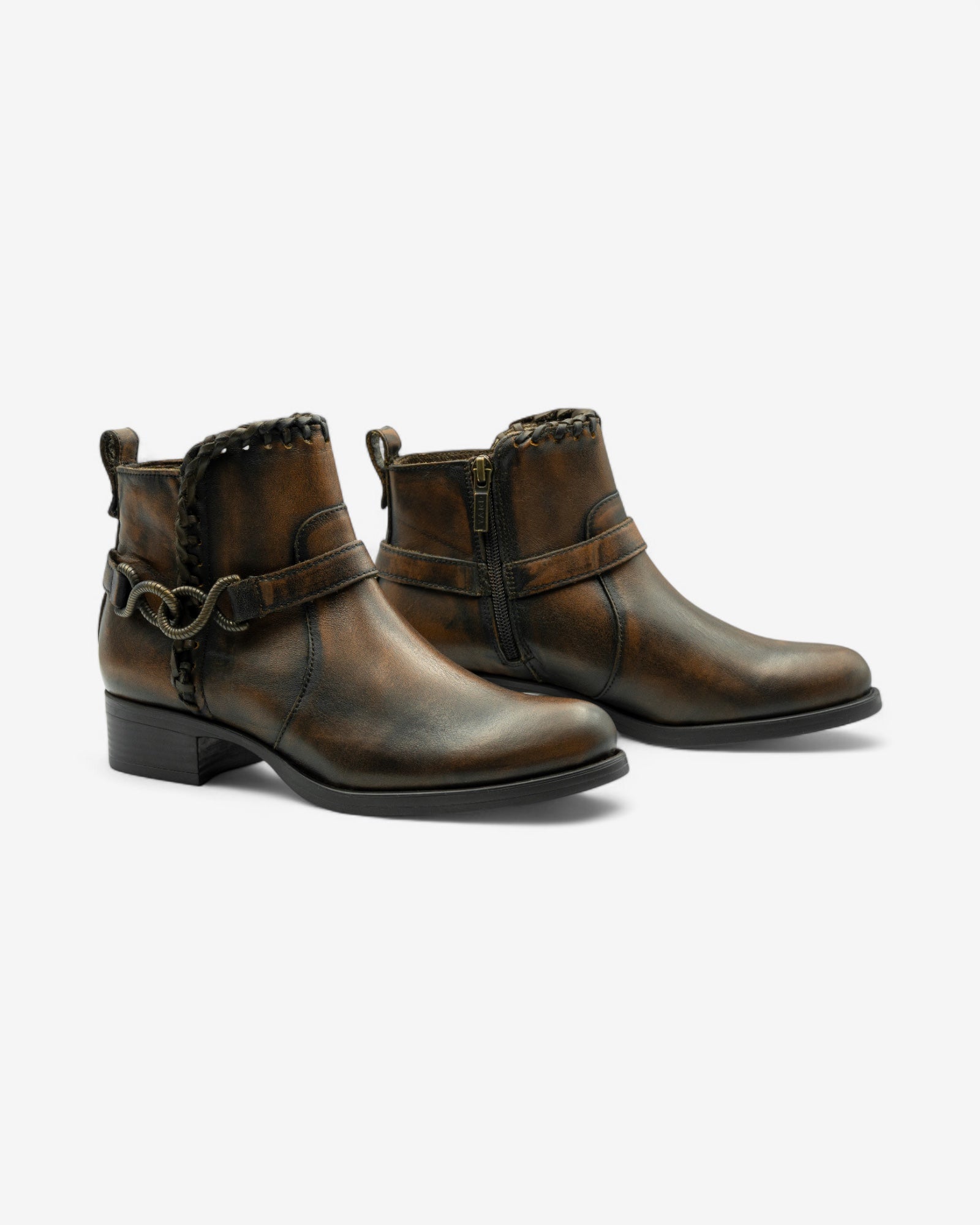 El Lazio es un botín de perfil bajo con construcción firme y detalles cuidadosamente trabajados. Confeccionado en piel, incorpora un trenzado artesanal en caña y empeine, además de una aplicación metálica lateral que aporta personalidad sin exceso.