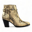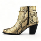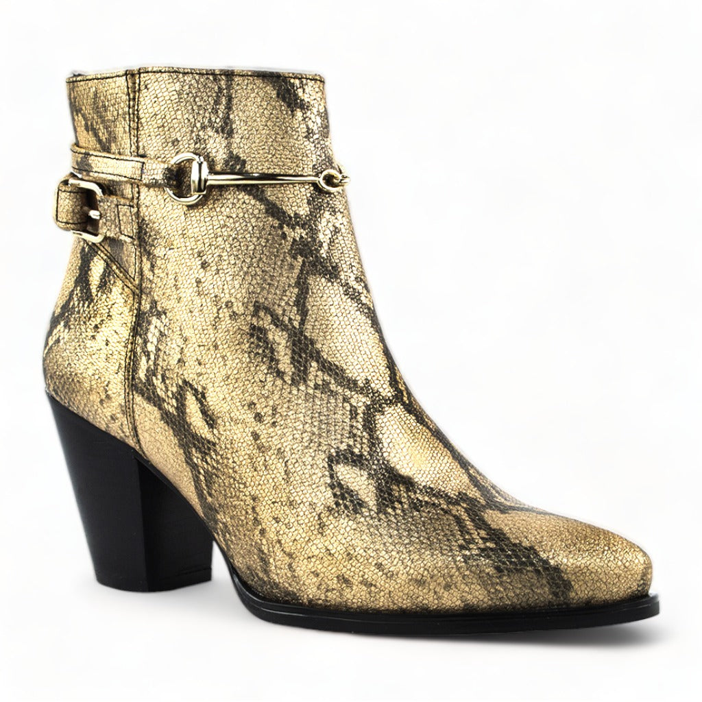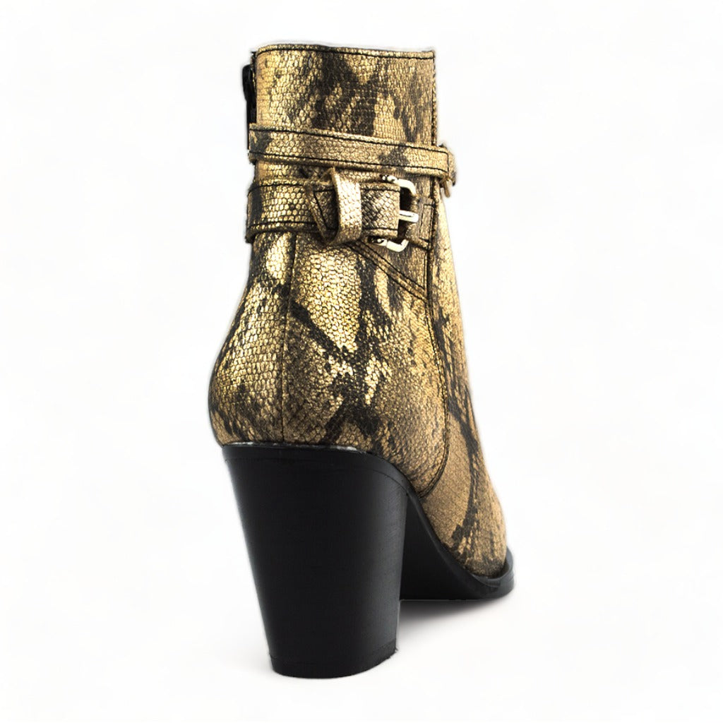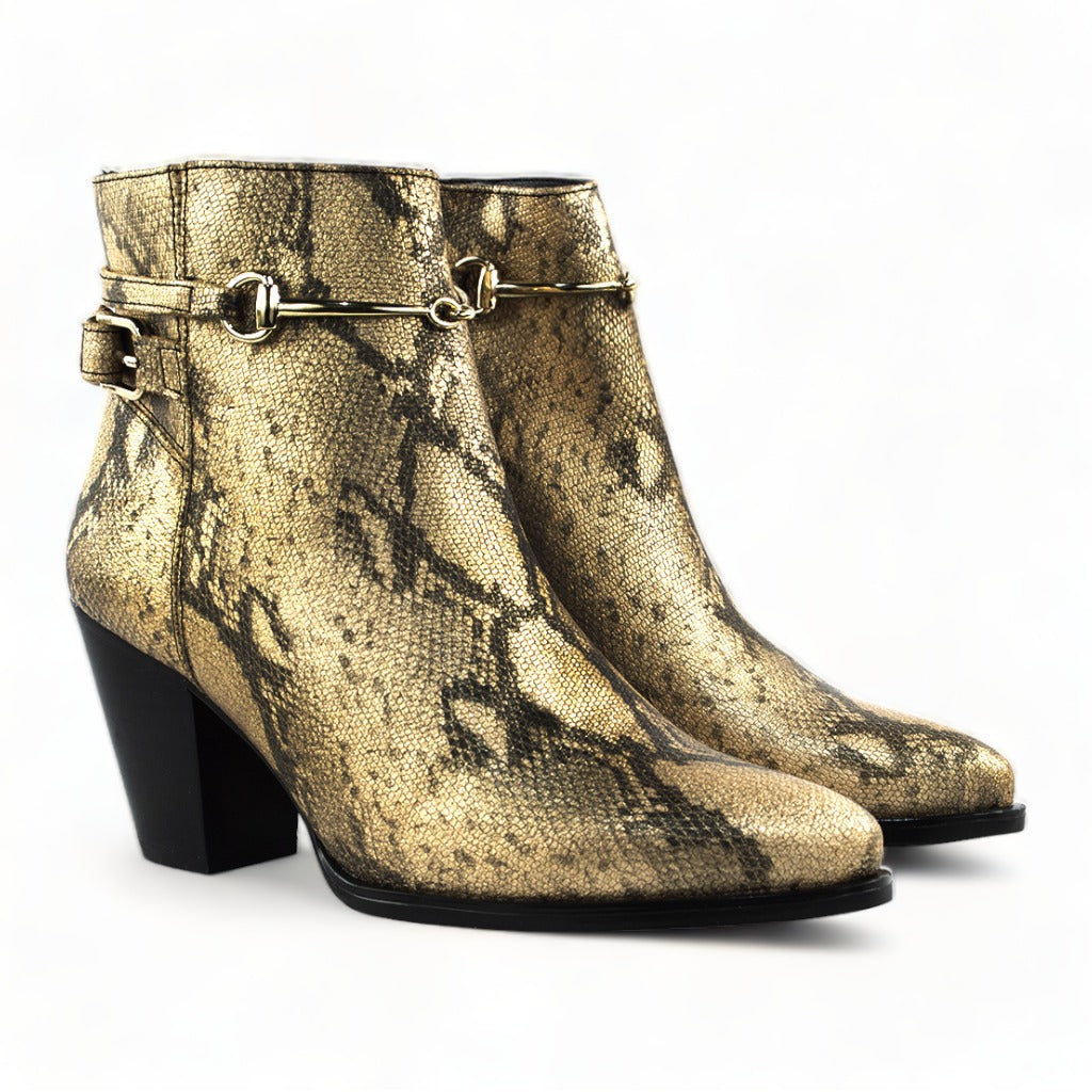 El botín Cristel es un calzado elegante y versátil que te acompañará en cualquier ocasión. Confeccionado en piel con un llamativo estampado de serpiente en tonos dorados y negros, este botín se convertirá en la pieza central de tu atuendo.