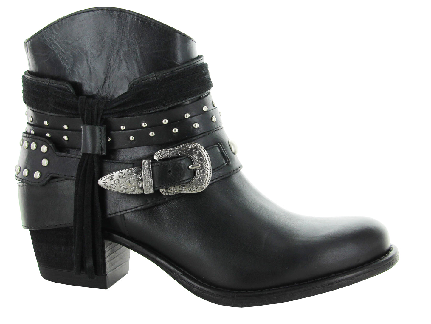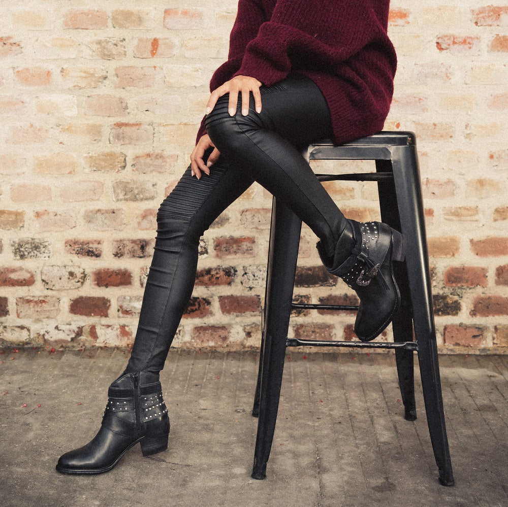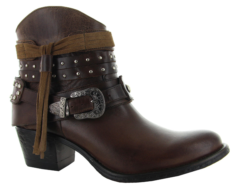 Modelo de botín con adornos en arnés usando elementos tradicionales western para crear un estilo clásico y vanguardista