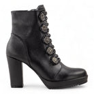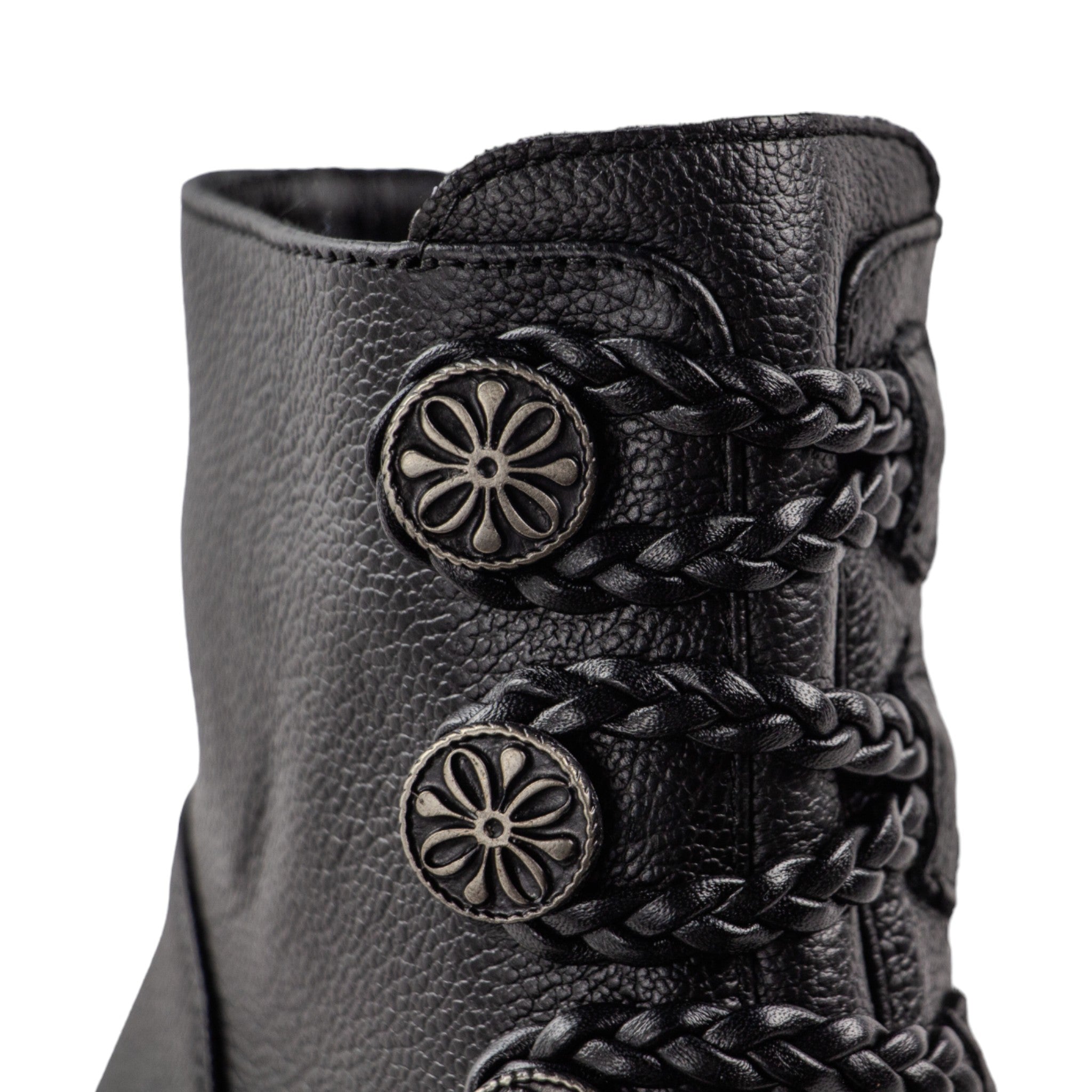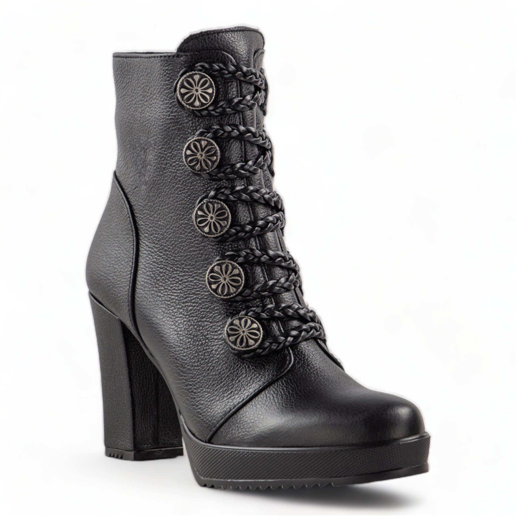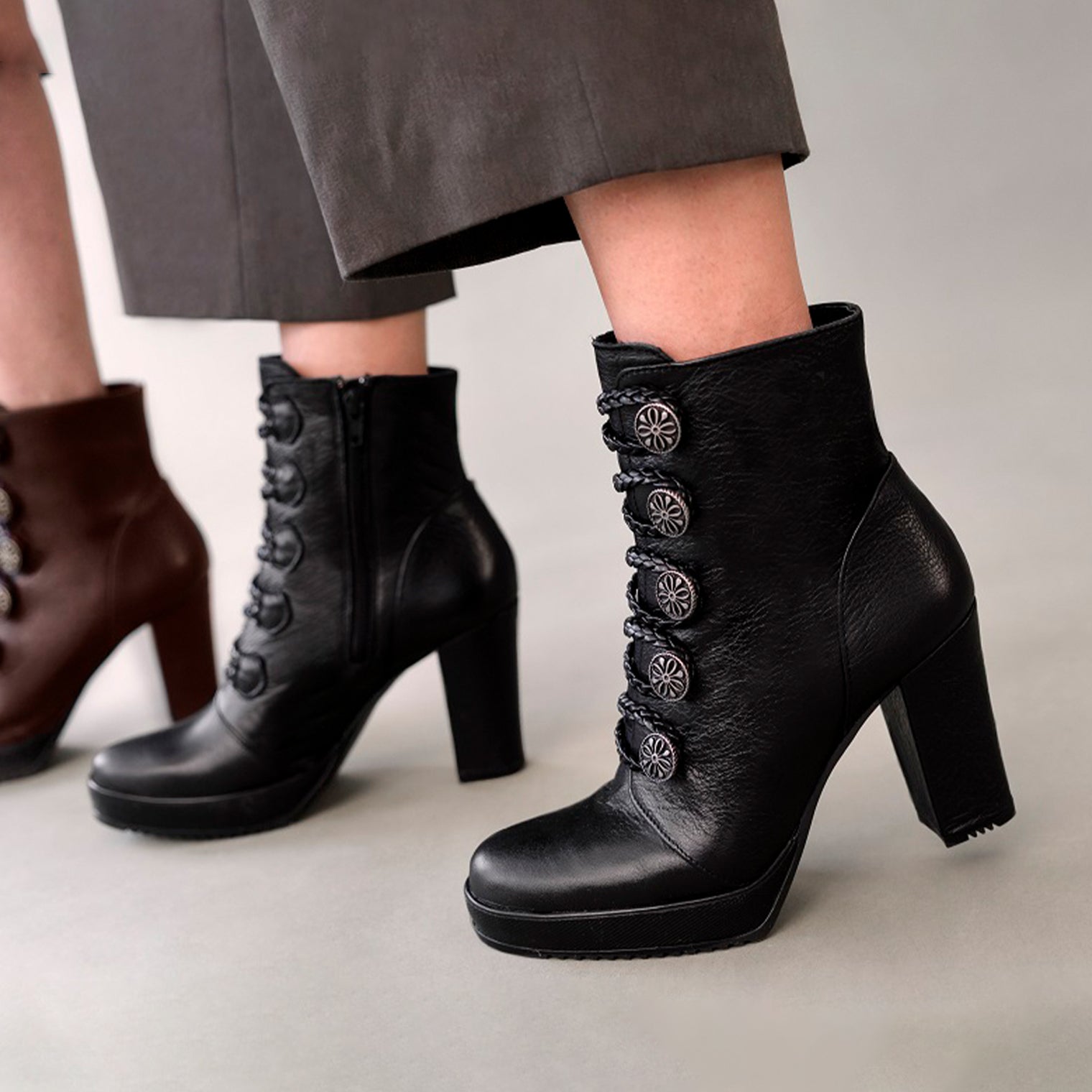 El Sello de un Icono: Su carácter es inconfundible. Los maxi botones de inspiración vintage, sujetos por una delicada presilla trenzada, son el detalle que lo eleva de un simple botín a una pieza de diseño atemporal. Es elegancia que se nota.