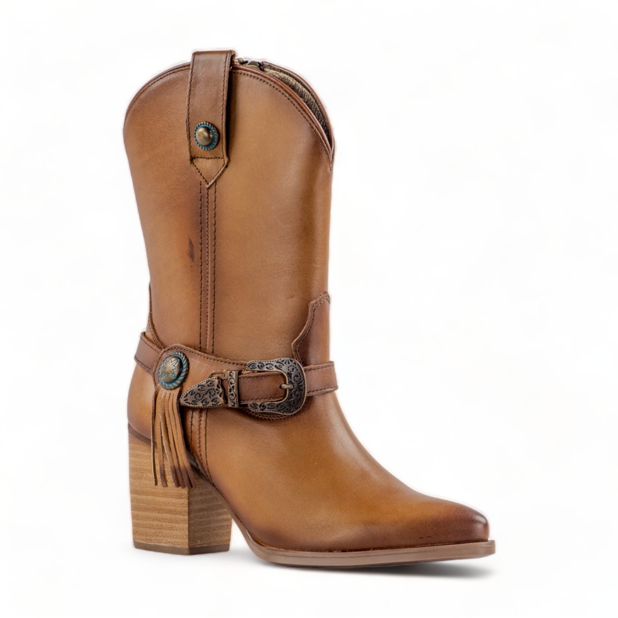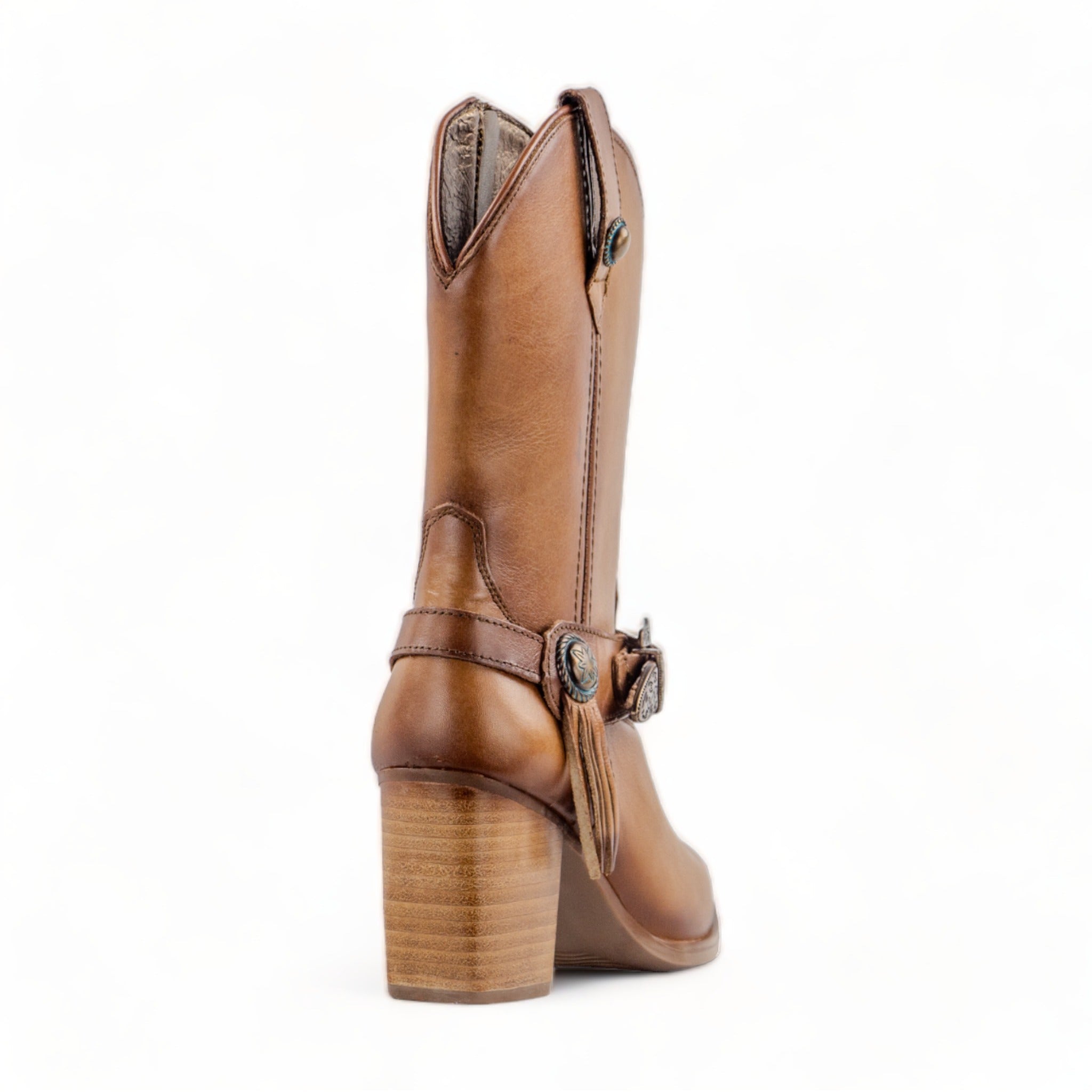 Destaca por su correa con hebilla decorativa, flecos laterales y detalles metálicos que realzan su personalidad. El forro en piel de cerdo garantiza comodidad y ajuste natural.