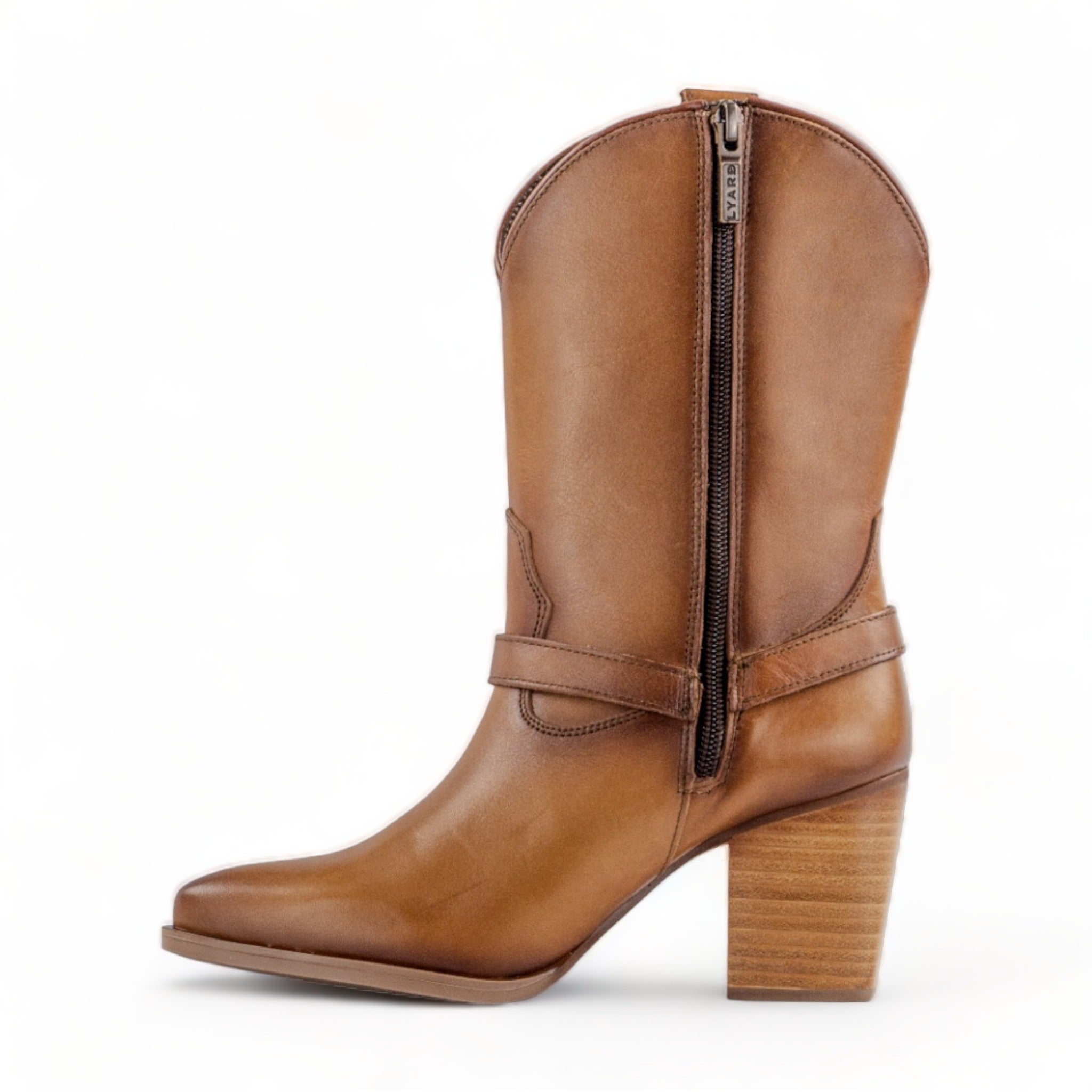 La Cecilia es una bota de media caña en piel genuina, con silueta inspirada en el estilo western. Incorpora un tacón de bloque medio que brinda estabilidad y un diseño estructurado que estiliza la pierna.
